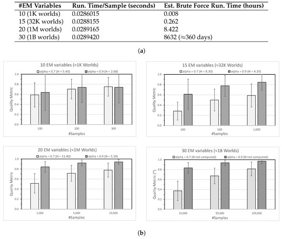 - The proportion of repeated samples (i.e., wasted effort) was quite high for both entropy levels; for (higher entropy) on average 52% of samples were repeated, while for (lower entropy), an average of 87% were not unique. For the 20 EM variable case, the quality levels were achieved with only 2293 and 469 unique samples, respectively. Larger sample sizes also lead to lower variation in quality (shorter error bars).