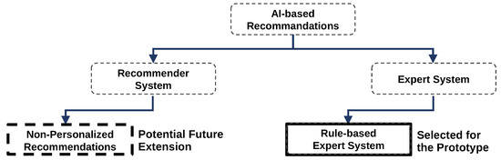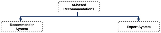 AI-based recommendations are essential to people’s private and professional digital lives. Examples of personal applications comprise product recommendations on e-commerce providers such as Amazon [9], and the advice of suiting movies and shows by streaming providers such as Netflix, that analyze user’s preferences and usage data [10]. Examples for professional applications include the selection of potential job candidates for HR [10] and the support of employees through domain-specific recommendations, e.g., medical diagnosis recommendations or mechanical repair instructions [11]. Two possible AI methods for recommendations are Expert Systems (ES) [9] and Recommender Systems (RS) [9,10] as shown in Figure 2.