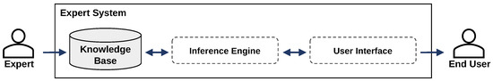Figure 4 shows the essential components of an ES: the Knowledge Base (KB), the inference engine, and the user interface. The KB consists of knowledge “as both facts and heuristics” [9] that was provided by expert users to the ES. The inference engine processes these facts and heuristics to validate an objective (backward chaining) or to infer new knowledge (forward chaining) [9,12]. Finally, a user interface presents the inference result to the system’s end users [9,12].
