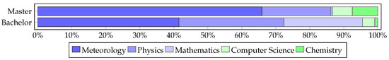 The typical starting point of the professional careers of meteorologists is usually a dedicated study majoring in meteorology. The proposed methodology to identify common minimum computer science skills is analyzing meteorology curricula. As there exists no comparable analysis, the authors of this paper analyzed 17 Bachelor’s and Master’s meteorology programs in nine German universities. The authors divided the courses in the programs into five categories: meteorology, physics, mathematics, computer science, and chemistry. The results are weighted according to credits, weekly duration, or course occurrence (in this order depending on the available information) and visualized in Figure 6.