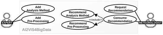 The three practical meteorological data use cases applied the algorithms KM, PCA, LR, KNN, SVM, and RF. Therefore, a system intending to support users with meteorological backgrounds shall support at least these algorithms. Meteorological users lack computer science expertise. Thus, the system shall not only help them in selecting suitable data analysis methods. It shall also inform them about potential pre-processing steps to make data analysis methods applicable. Another requirement is that the system is extensible for different analysis methods and pre-processing. All derived use cases are visualized in Figure 7. The extension of the system with additional analysis and pre-processing methods are two expert user use cases. Meteorologists, as end users, request and consume recommendations (two use cases). The “consume recommendation” use case requires the system to recommend an analysis method, pre-processing, or both (two use cases linked with the include notation).