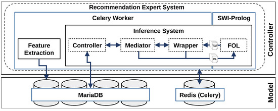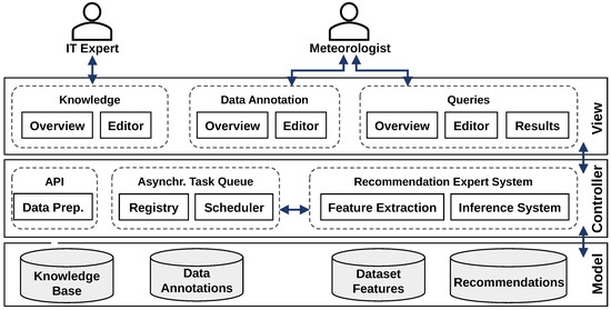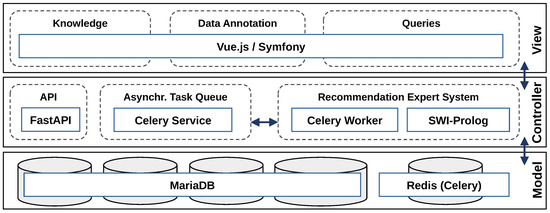 Figure 9 shows the proposed Model-View-Controller (MVC) [26] architecture to implement this workflow. It consists of the KB, data annotations, features, and recommendations in the system’s persistence and three user interfaces for expert and end users. The controller consists of a data preparation Application Programming Interface (API), an asynchronous task queue, and the recommendation expert system. The asynchronous task queue was placed in front of the recommendation expert system so that the system can process queries in parallel and users are not slowed down by waiting for the jobs to finish.