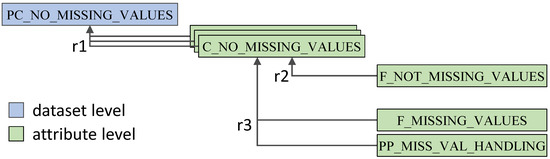 The high-level preconditions in Table 1 were then further divided into attribute-related atomic facts to implement a hierarchical rule structure in the KB. The hierarchical structure and pre-processing rules enable the KB to derive suitable analysis methods and suggest necessary pre-processing. Figure 10 shows the breakdown for the precondition “no missing values” from dataset level to attribute level (r1) and further into either no missing values for each attribute (r2) or missing values yet applying proper pre-processing (r3).