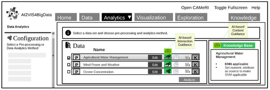 The User Interface (UI) concept was introduced by the authors of this paper in [5] and contains interaction as well as content guidance. In this paper’s conceptual model, the UI concept is extended on recommendations for suitable analysis methods as interaction guidance, a textual description of applicable analysis methods, and suitable pre-processings as content guidance. Integration into the reference model’s UI concept is visualized in Figure 12.