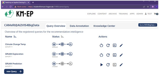 The user interface is divided into a query overview, data annotation, and a knowledge center. These are accessible in the header of every page. Under query overview, a user can create and run queries against the “Recommendation Expert System” and view their results. Under data annotation, data sets already integrated into the system can be extended (annotated) with features that cannot be determined automatically. Finally, the rule-based knowledge base can be managed under the knowledge center. Figure 15 shows the query overview for three data sets. Two queries have been executed in the screenshot, while one query can still be started (play button).