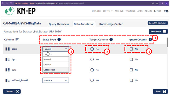 The four tasks were broken down into 21 necessary actions as ground truth before the evaluation. Following the cognitive walkthrough methodology, the evaluators in the peer group had to identify necessary actions for each task by themselves. Figure 17 shows the action of annotating of previously unset columns. As this example shows, the performed actions were single mouse clicks, yet a combination of logically connected steps within one view of the user interface. The example in Figure 17 shows the steps of getting an overview of possible annotations (1) and setting the scale type of one data column (2). Further efforts are making this data column the single target column or not (3) and selecting whether to ignore this data column (4).