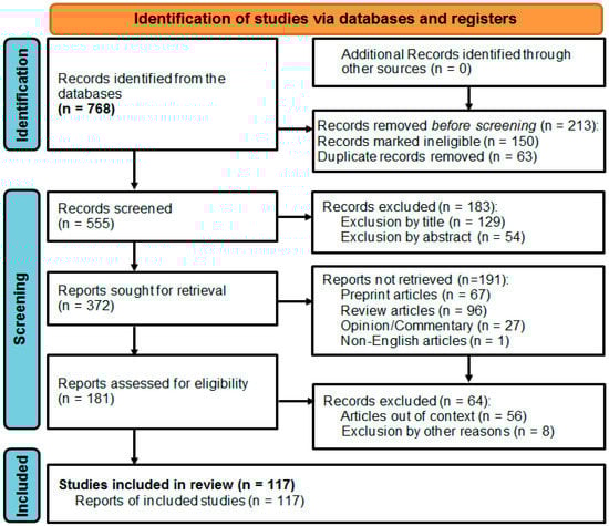 The selection procedure is in Figure 1. We excluded preprint and review articles, whereas published studies that are observational, interventional, related to modeling, or case studies focused on manual, semi-automated, and automated contact tracing were included. From the 768 articles yielded by the database searches, we analyzed and removed all the duplicate articles that were identified from the different databases. Thus, 213 articles were filtered out reducing the articles to a total of 555 articles which were screened based on titles for study relevance. The relevance of 54 articles could not be directly determined based on their titles, thus abstracts of such papers were considered to make a decision. Further, a full-text review was carried out to make up the assessment for the remaining articles where authors lacked certainty regarding their relevance to the study objectives. A post-title filtering stage was observed and a total of 183 articles were further excluded. These included 53 articles the authors determined to be irrelevant upon screening the abstracts. Thus, 372 articles were sought for retrieval. Additionally, further screening was done to assess articles’ full texts and decide on inclusion eligibility based on the criteria in Section 3.1. Finally, 117 eligible articles were downloaded for the review [1,2,3,4,5,8,9,10,11,12,14,16,17,18,19,21,22,23,24,25,26,27,28,29,30,31,32,33,34,35,36,37,38,39,40,41,42,43,44,45,46,47,48,49,50,51,52,53,54,55,56,57,58,59,60,61,62,63,64,65,66,67,68,69,70,71,72,73,74,75,76,77,78,79,80,81,82,83,84,85,86,87,88,89,90,91,92,93,94,95,96,97,98,99,100,101,102,103,104,105,106,107,108,109,110,111,112,113,114,115,116,117,118,119,120]. The data extraction procedure was done by four authors, whereas the data validity and accuracy were confirmed by the other authors. The articles were downloaded in full text and stored in a database that was shared by all of the authors. We extracted the articles’ authors, titles, publication year and journal, keywords, and abstracts. Upon carrying out the full-text review, the aim and purpose of the studies were analyzed along with the contributions to knowledge. We also analyzed the studies’ hypotheses and findings to comment(s) on their strengths and limitations. We were able to create information related to our study questions using the extracted data, particularly in determining the major strategies and factors that are considered for COVID-19 contact tracing systems development.