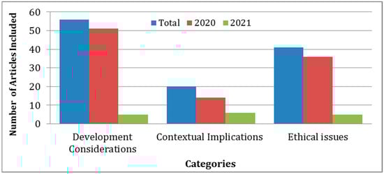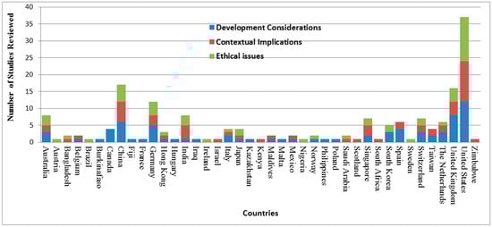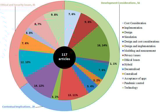 Altogether, 117 research papers were selected for this methodical review. This represents 93.60% of the articles that were considered for full-text review and that satisfied the purpose (i.e., objectives) of this review study; hence, the remaining eight articles were excluded. In total, 86.32% (n = 101) of the articles were published in the year 2020, which indicates the immediate response that was given to studying the new pandemic upon declaration. As shown in Figure 2, these studies were carried out in a total of 41 countries. Some articles covered more than one key consideration simultaneously and by counting in this respect, a total number of 179 studies were realized. Overall, the African continent has a low number of studies (2.79%, n = 5) that pertains to development and deployment of contact tracing systems for COVID-19 prevention and containment all through the pandemic. More studies were reported from the United States (20.67%, n = 37) followed by studies done in China (9.50%, n = 17) and the United Kingdom (8.94%, n = 16) compared to what has been reported from the other countries. Similarly, it was observed that the United States gave approximately equal focus to the three different sensitive issues, i.e., the development considerations (32.43%, n = 12), contextual implications (32.43%, n = 12), and ethical issues (35.14%, n = 13) based on the articles investigated in this study. Apparently, a significant higher weight was given to ethical issues in the country. The situation is not remarkably different in China as the data reveal values of 35.29%, 35.29%, 29.41% for the three key considerations, respectively. Of the three main categories that were considered, it was found that more research efforts (47.86%, n = 56 articles) focused on design and implementation strategies to facilitate effective contact tracing systems. During the short pandemic time, a good number of automated and semi-automated tracing apps have been deployed especially in developed countries. Unlike using manual contact tracing apps during previous outbreaks like the Ebola virus, the recent development could be understood to have rapidly improved with the recent development and widespread of technology such as Bluetooth and location-based technologies. These can offer more possibilities such as preventing global viral outbreaks in the near future as well. In addition to having more study focused on design and implementation strategies, a good number of studies were also published on ethical and security issues. Some articles related to the subject matter that focused on ethical and security issues were published as opinions and commentary articles. Another trend found that researchers considered the related privacy, security, and ethical issues while developing and deploying contact tracing systems to be used in different countries. As reported in Figure 3 and Section 5, the 41 studies (35.04%) in this category also focused on development and/or evaluation of contact tracing apps, but with emphasis on users’ data security and privacy. Meanwhile, a total of 15 (excluded) studies appeared as review or commentary articles.