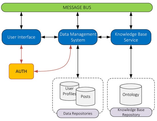 This section provides a high level overview of the architectural design of the IMMERSE system. Figure 1 describes the logical design of the IMMERSE platform, which shows how the different components are organized. The platform is comprised of a number of components, each of which has a specific function to perform. These are the following: (a) the Data Management System (DMS) component, which is in charge of efficiently storing heterogeneous data, (b) the User Interface (UI), which serves as the system’s primary entry point, (c) the Authentication component (AUTH), which is used to secure the numerous operations carried out within the IMMERSE system, thereby enhancing data protection, (d) the Knowledge Base Service, (KBS) which primarily accesses the IMMERSE ontology, and (e) a Message Bus (MSB), which serves as the primary channel for all intercomponent communication.