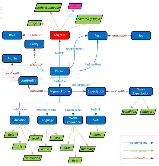 The representation of the profile of a migrant user in the ontology is illustrated in Figure 3. More specifically, the MigrantProfile class refers to information relevant to the migrant’s resume. Five classes have been used to represent the migrant’s resume (a) Language, (b) Education, (c) Work Experience, (d) Skill and (e) Expectation, each associated with a set of data properties as shown in the figure.