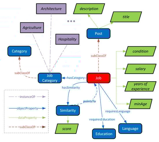 The class Job is used to represent a job that is posted in the platform. It is a subclass of the class Post from which it inherits two data properties, its title and description, while it has four other data properties dedicated to the class Job as depicted in Figure 4. Each job has a Category where several instances of this type are instantiated in the ontology. Finally, each Job is linked with other similar jobs through the property hasSimilarity that points to a class of type Similarity. For each similar job, the ontology contains a property called score and an object property called pointsTo that points to a similar job in the domain ontology.