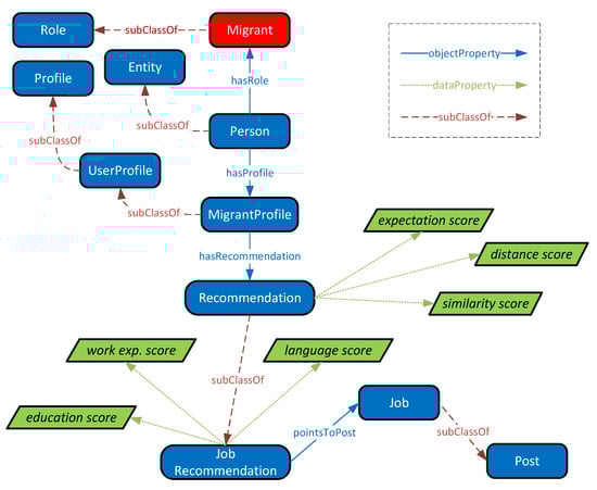 Migrant users can receive recommendations based on the information that they have provided in their profiles. The class Job Recommendation in Figure 5 is a subclass of the class Recommendation. Recommendations are generated and a score is calculated based on the user’s (a) education (property education score), (b) work experience (property work exp. score), (c) spoken languages (property language score), (d) expectations from using the platform, defined by users while creating their profile, such as finding a full time job under a specific category (property expectation score), (e) distance from the job’s location (property distance score) and finally (f) a score based on the similarity of the given post to other posts that the user has either applied to or saved for later (property similarity score).