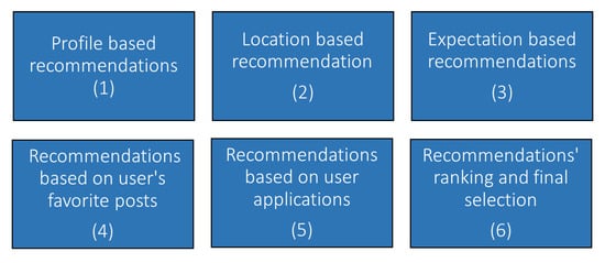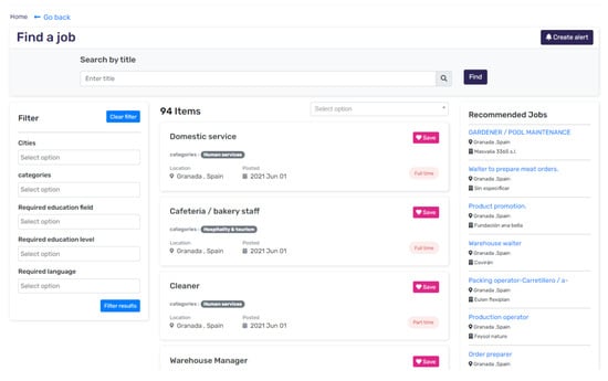 In addition, Ref. [] presents Proactive, which is a comprehensive job recommendation system that assists job seekers in a variety of ways in finding appropriate opening jobs. The system depends on a series of ontologies for collecting and storing job related metadata such as the job’s category, required educational level, experience and position type (i.e., full time, part time, etc.). This set of metadata fields is also extended with geographic information. This allows for calculating distance-based similarity between users’ geographical preferences and job locations. In order to provide jobs that fit a user’s profile and are nearby them, our matchmaker additionally uses geographical information from both job posts and users to produce a weighted score that takes their distance into account.