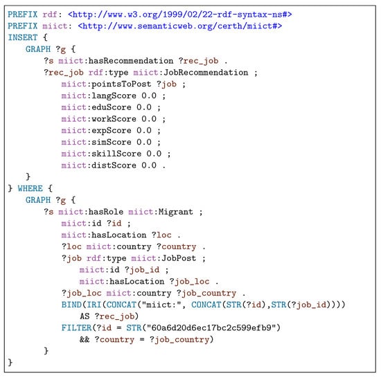 The step prior to any other execution of the semantic reasoning component is the initialization of the triples that will be used throughout the calculations. The SPARQL query in Figure 8 populates the appropriate properties and creates a link between the user and the posts offered in the user’s country as well as sets all scores to zero.