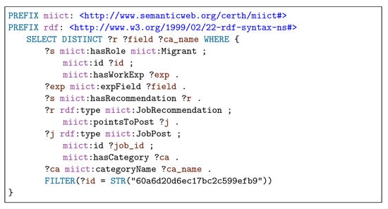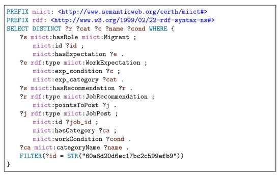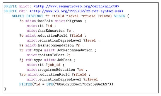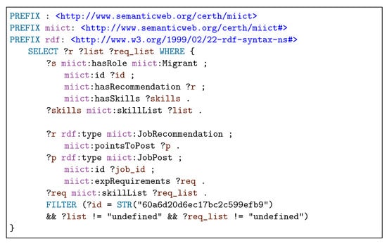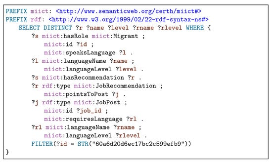 Through the UI, migrant users can define the languages they speak along with their level, and service providers can define the language requirements of the posts they are creating. This information is used by the semantic reasoning component to find which posts match the profile of the migrant considering the language. Even if the user does not provide any language, the system makes use of the user’s preferred language that is provided upon registration. The following SPARQL query in Figure 9 considers only posts that could be potentially recommended to a particular user as those have been calculated during the initialization step. It retrieves all possible combinations of languages spoken by a user and languages required by a post.