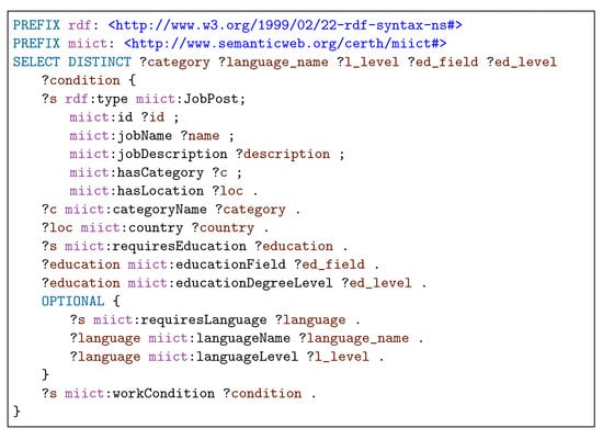 Simple Protocol and RDF Query Language (SPARQL) [] is a declarative language for extracting and updating information from RDF graphs that is recommended by the W3C community. It is an expressive language that allows the creation of complex relations between different entities and contains capabilities for querying required and optional graph patterns along with their conjunctions and disjunctions. Apart from that, SPARQL can be used to describe rules for generating new RDF graphs by combining data from existing graphs into new ones and by using the CONSTRUCT graph pattern. CONSTRUCT determines which RDF triples should be added to the new graph based on a set of matching criteria applied to existing graphs (i.e., WHERE clause). The CONSTRUCT query form returns a single RDF graph defined by a graph template. The output is an RDF graph generated by substituting the variables in the graph template for each query solution in the solution sequence, then setting union to join the triples into a single RDF graph.