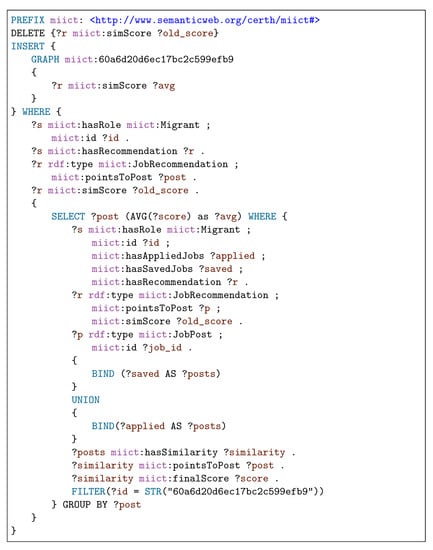 Eventually, every time a new post is added to the platform, the reasoning component first calculates which posts are similar to it. It then starts re-calculating recommendations based on favourite posts and applications for each user living in the same country. The following SPARQL rule, depicted in Figure 15, queries the ontology to find all the posts that the migrant user has either saved or applied and also finds which posts are similar to them. For each similar post, it also queries the final similarity score and uses it to update the property simScore that holds the score of the recommendation object.