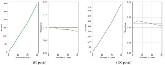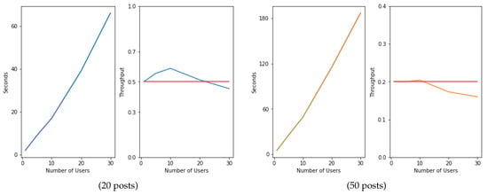 To measure the response time and see how well our system scales while increasing its processing demand, we decided to split the evaluation process into four phases. In each phase, we would gradually increment the number of available posts and then, for every phase, we would also increment the number of concurrent users for which the system would have to calculate recommendations. To measure the scalability of the system, we used a metric called throughput, which is defined as the number of recommendations per second.