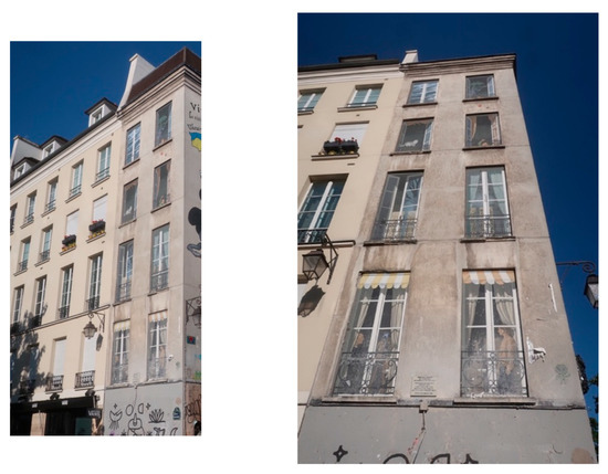 An example of a trompe-l’œil painting emulating a façade with windows (the two rows of windows on the right are not real, as can be seen in the close-up in the right image). This is on a building near the Centre Pompidou in Paris.