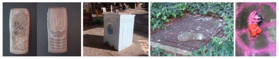 Other modes of expression also occur in Street Art, such as the ‘guerrilla knitting’ or ‘yarn bombing’ when knitted structures are added to the environment, on physical objects such as lamp posts, bike racks and traffic signs. In Sydney a common presence are the little (and sometimes not so little) concrete sculptures by the artist Will Coles. These are 1:1 facsimiles of everyday objects such as phones, remote controls, squashed cans, guns, radios, even televisions and washing machines cast in concrete and glued to walls, kerbsides, and other structures in the public space all over Sydney since 2007 (the sculptures that are sold are usually made out of more expensive materials and finishing). The objects often have words on them, commenting on their ways of use, and materialism and consumerism in general (as it is put on his web site [30]: “embedding dissonant words and sentences into his concrete casts of seemingly banal objects”). Coles has since left Sydney (in 2015), but his traces are still around. There is still an abundance of sculptures, often concentrated around art galleries where he exhibited (such as the Casula Powerhouse Arts Centre in 2014, and the Outpost festival). With my son, who was born in 2010, we often find new spots where the Will Coles sculptures still survive—even in an obscure alleyway in Chippendale (the suburb where we moved to in 2021) he found one.