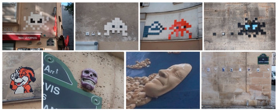 Examples of physical street art in Paris: Invader (top row), and bottom row from left to right: Zigom.art, Titiskull, Gregos, Backtothestreet.