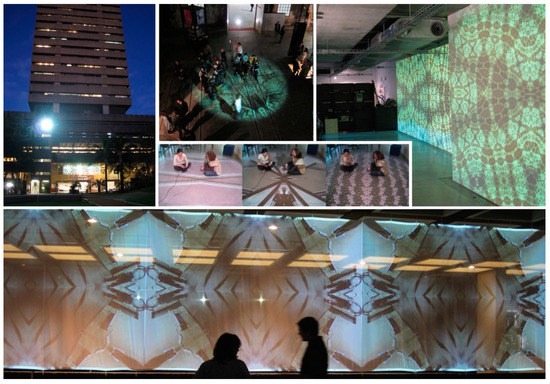 For the Facets piece in the Art Light exhibition as part of Vivid in 2009, in the public space of UTS main foyer, we had a custom made projection surface of 12 m × 3 m with three projectors. This screen was semi-transparent, with the aim to overlay the resulting video patterns projected while being able to see the space behind and around it, to extend the environment rather than replacing it. There were multiple sensors embedded in the furniture, so that the pressure and balance of people on the seats was detected, and several motion sensors built in wooden blocks that the audience could manipulate. Through these sensors, people were able to create the kaleidoscopic patterns, responding to their movements and in effect co-creating the images. This was always the intention, to research how audiences can participate and become engaged in generating their own imagery. The resulting video patterns projected were visible from the outside of the building at night, engaging in a dialogue with the architectural structure of the UTS Tower. Further versions, all described in the paper Interactive video projections as augmented environments [45], were Facets Through the Roof (five circular kaleidoscopic projections on the curved ceiling, commissioned by the Powerhouse Museum in Sydney—each projection was controlled by a unique set of interfaces, including a sensor jacket), Facets Kids (also in the Powerhouse museum, as an audience interaction study [47]), and Facets Pool on the floor of the Interactivation Studio as part of the Sydney Design Festival, all in 2009. The latter was further developed in the piece Facets Expanding Architecture commissioned by the Expanded Architecture exhibition in Carriage Works theatre in 2011 [48]. The projection used footage of architectural structures that I had collected, including the building itself (a converted former train workshop). It was presented in a circular projection on the floor, with kaleidoscopic patterns controlled by the audience by motion sensors hanging above them.