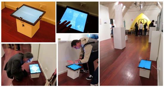 In 2014 I developed a smaller version of the Facets interactive kaleidoscopic patterns. This was a commission for a group exhibition in small gallery in the suburb of Chippendale, near UTS. The curator challenged all the exhibitors with a specific and very limiting brief: the works had to each fit in a volume of 20 cubic centimetres, and had to be black and white or grayscale, as reflected in the title of the exhibition 20 × 20 × 20/no colour, and in the title of my piece, Facets—shades of grey. It was interesting to explore the more intimate scale of this size, placing three proximity sensors around the screen which allowed the audience to create the patters by approaching it with hand or other movements, standing above it or crouching down as can be seen in Figure 6.
