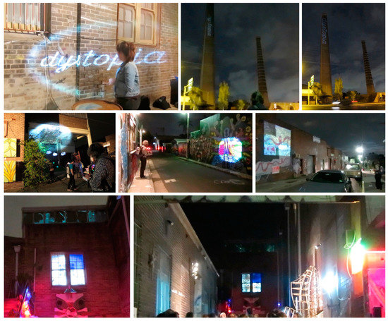 For a street art festival in the suburb of St Peters in Sydney, Night Garden by the Tortuga Studio in September 2014, video material was prepared from the dense graffiti and murals captured locally in addition to other suitable footage. It also included footage of some of the other artists in this event, from an event a couple of days earlier (Beams festival in Chippendale). In this case, I was able to project the image of a neon artwork (of the word “Dystopia” which partially flickered revealing the word “utopia”, by the artists Jasmin Poole and Mike Rossi) on the wall before the artists were finished installing it. They appreciated the act, which was presented as a homage. Later I projected the text on the iconic chimneys of the nearby former brick kilns in Sydney Park. This was part of the VideoWalk projecting the colourful graffiti patterns around the laneways and buildings in the area at the Night Garden event. At this event I also set up a version of Facets, using multiple video projections from the inside on several windows of an empty building overlooking the main laneway of the festival. The patterns were controlled by the audience movements through motion sensors hanging above the people. Some of the projections are shown in Figure 8.