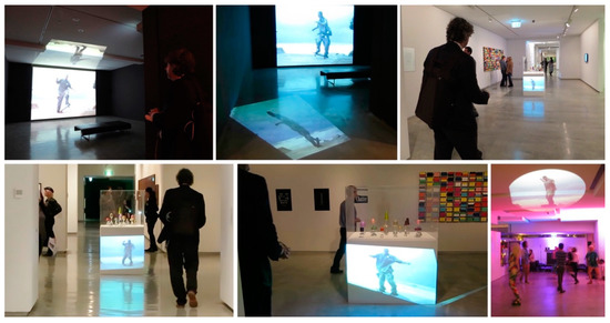 On another occasion, as part of the Art Bar event in February 2014 at the Museum of Contemporary Art in Sydney, there was the opportunity to VideoWalk around in the museum, using footage from earlier exhibitions at the site to address walls and other surfaces (particularly the work of Olafur Eliasson in early 2010 [11], and interactive video works by Rafael Lozano-Hemmer in early 2012 [12], both artists whose work I greatly admire and am inspired by). Furthermore, imagery of events on the evening was captured, and of the current exhibitions, to re-situate and distribute in new ways. The latter needed to be done quick, because although it was a commissioned performance and included in the official programme for the evening, we got in trouble for projecting in certain areas of the museum. Which meant we could not do a practice run of filming the activities, and had to improvise without an attempt to rehearse. This eventually worked well with a piece by video-artist Shaun Gladwell, whose work I greatly appreciate. The piece, Storm Sequence (2000) is one of Gladwell’s best known works. It has been on display for years at the MCA, and was included in his solo exhibition in 2019 which also had AR versions of his pieces in specific locations so that it only showed on a handheld screen as if it was on the wall (through a smartphone or tablet app) [51]. The video shows the artist (in his trademark slow motion) doing tricks on a skateboard on a concrete surface at Bondi beach in Sydney, while dark storm clouds are approaching, eventually bring the first drops of rain. It is very atmospheric, a bit brooding and with a looming presence of the storm. On the evening a short (28 s) fragment was captured of the 7.59 min Storm Sequence piece, and loaded it in the VideoWalker set-up. The fragment was projected back on to the actual projection, and then slowly moved away from the screen, seemingly cloning the image by ‘peeling’ it off the screen, and then taking it ‘for a walk’ around the museum as shown in Figure 10. Great care was taken not to interfere with the other artworks encountered on the way, instead projecting on plinths, walls and nooks (and responding to questions of inquisitive museum visitors). It seemed appropriate to me, a sense of liberating Shaun Gladwell from his dark room at the back of the museum where he had been waiting for the storm for so many years, and taking him around the museum, meeting visitors, later joining other people dancing in the bar area, and eventually being projected on the hull of a large cruise ship docked at the terminal at Circular Quay.