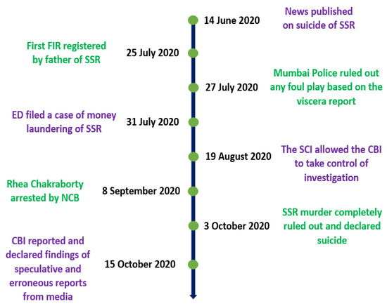 The significant events which took place after the demise of SSR are illustrated in Figure 1. Starting from finding the dead body until the confirmation of suicide by the supreme court, the timeline shows the behavior change of Twitter users based on these significant events.