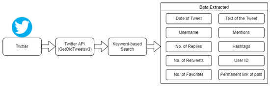 It was therefore decided to use the Python package, GetOldTweets version-3 [26] for the data collection. The package is appropriate for extracting the old posts based on the location or timeline of the tweets. The relevant data items extracted for each of the Twitter posts are date of tweet, username, no. of replies, no. of retweets, no. of favorites, text of the tweet, mentions, hashtags, id and the permanent link of the post. Figure 3 shows the steps of data collection process from Twitter.