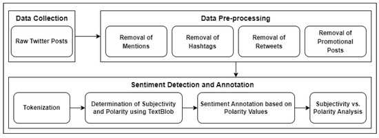 In more detail, the data is first collected from Twitter. Then, data pre-processing steps, such as removal of mentions, retweets and promotional posts are performed. After the pre-processing step, the posts are tokenized, where by tokenization [28] is meant the splitting of collections of words, for example sentences, into units that are amenable to sentiment analysis. Determining the subjectivity and polarity value of a given text is then done using the Textblob package [29], which is a python package that enables the determination of the subjectivity and polarity values of a given text. The text could either be a single sentence or a whole a paragraph. Word-by-word polarity values are then utilized to determine a final polarity value for a given text fragment. From this polarity value the sentiment class (i.e., positive, negative and neutral) is determined and annotated.