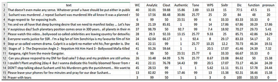 After segmenting these parts as a data pre-processing step, the processed data was fed into the LIWC system for feature extraction. Some of the posts were removed using the above criteria and 15,566 Twitter posts remained that could be further analyzed.