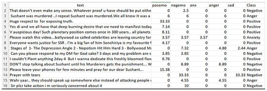 For the emotion detection and annotation, the psycholinguistic feature extraction step were performed (shown in the Pseudocode in Table 3). The sample of the outcome for the LIWC feature categories is shown in Figure 5. Along with the texts from the dataframe, the numerical values for some of the LIWC features are shown. As we can see, the output is a floating-point number, due to the average weighted counting in the LIWC dictionary. Figure 6 shows the “Class” which is being generated and added to the dataframe (shown in Pseudocode 2). Along with the Affect Category Counter entries, “posemo”, “negemo”, “anx”, “anger” and “sad” are added representing the positive emotion, negative emotion, anxiety, anger and sad values.
