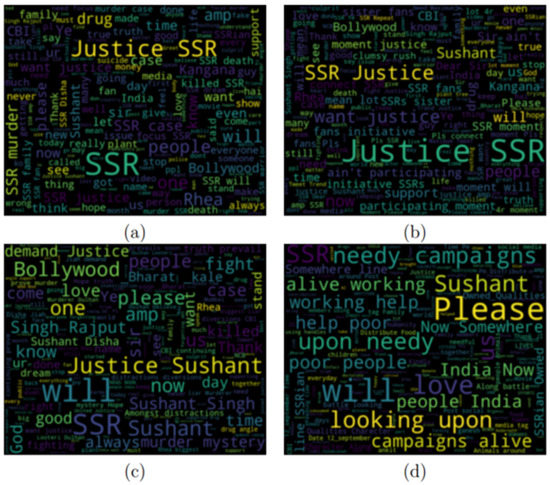 Word cloud using the (a) #SSR, (b) #JusticeForSSR, (c) #WorldUnited4SSR, and (d) #Food4SSR.