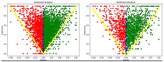 The subjectivity vs. polarity graph is depicted in Figure 9. for #SSR and #JusticeForSSR. From the literatures [39,40,41,42,43], it is evident that the subjectivity vs. polarity graph creates a v-shape that is also found in this study. Basically, the higher scores of subjectivity means the sentence if more formal, therefore, the polarity scores are also closer to zero, except for some exceptions.
