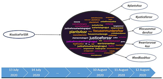 A hashtag network graph was generated based on the viral hashtags being used in the posts and the connection between the primary hashtags and the new hashtags was used to identify the trendy hashtags in this special context. The Python NLTK package [30] and Python Regular Expressions (RE) [27] was used to extract regular expressions. The most used hashtags were extracted using the initial hashtags #SSR, #JusticeForSSR, #WorldUnitedForSSR and #FeedFoodforSSR. Using these hashtags, all the associated hashtags used on the same posts were collected. These extracted hashtags were used for generating word clouds. The mostly used hashtags are detected form the word clouds and used as viral hashtags for the further analysis. In Figure 10 and Figure 11, timelines starting from 13 July 2020, the day of the SSR demise, are shown and new hashtags are first detected in August 2020.