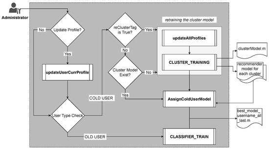 An administrator can manually or automatically (according to a schedule) trigger the update of the user models. Before training the model, the administrator can choose to update the current user or not, read all the users’ current profiles, and put them all into one table as the input data to the cluster training module. The administrator can also upload other users’ profile data supplied by third parties to help the system train a better model at the first stage.
