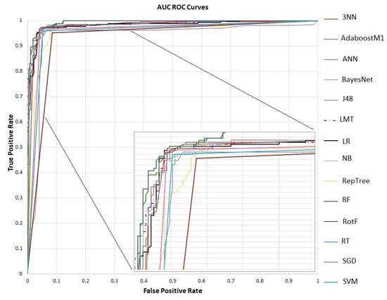 Specifically, in Table 4, we provide the models’ performance evaluation after SMOTE with 10-fold cross-validation. All our proposed models present percentages greater than 93.3% (RT). The best performance is achieved by the RotF model, which has the RF as its base classifier. It presents accuracy, precision, recall and F-Measure equal to 97.1% and an AUC of 99.3%. In addition, it should be noted that high percentages of AUC are achieved by RF with 99.1% and AdaBoostM1 with 98.5%, which has RF as its base classifier. Finally, in Figure 2, we plot the AUC ROC curve of the proposed machine learning models, where the superior performance of RotF is confirmed.