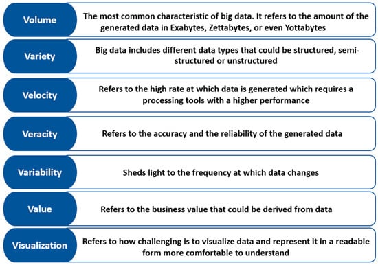 In the last decade, data analytics has shown great potential for supporting organizations to improve their business and to get closer to their customers. Indeed, data are considered as one of the most valuable resources that industries rely on for decision-making. However, the benefits of data could not be reached if the data are of low quality. Using unstructured and inaccurate data may bias data analytics and lead managers to make wrong decisions. Therefore, data quality has gained wide attention from both academics and organizations, and several approaches have been suggested and adopted in this regard [1,2,3]. With the rise of Big Data, ensuring data quality has become more challenging. Indeed, managing big data involves handling heterogeneous and messy data that traditional data quality tools could not manage. It is worth mentioning that the big data issues are not only related to data volume but also to other big data properties, known as the Big Data V’s. Over the last few years, big data characteristics have risen to more than 50 V’s [4]. Figure 1 presents the most common ones, the 7V’s of Big Data.