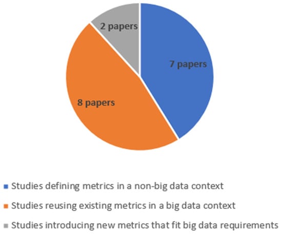This last step consists of reporting the main findings of the literature review and making conclusions. Figure 4 shows the number of selected papers corresponding to each type of content. This literature review shows a significant lack of works defining new metrics that fit big data requirements, which motivates us to conduct a deep analysis of the current state of the art to frame the need and make a significant contribution in this regard. The following section reviews the 17 papers selected for our study and highlights the main findings of this literature review.