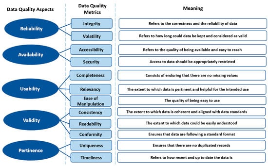 To easily understand and interpret data quality, the quality metrics could be grouped into specific categories called data quality aspects, which encapsulate metrics with shared traits. The data quality aspects add an abstraction layer to the quality metrics and, thus, provide more relevant and understandable insights about data quality which could support data managers during data analysis. Many classifications of the quality metrics have been suggested in the literature [34,35]. One of the most common classifications was introduced in [36], where the authors grouped the quality metrics into four categories: