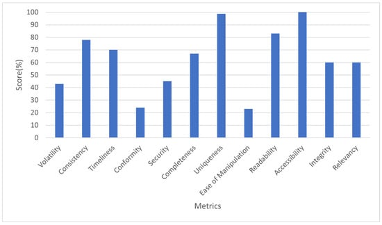 It is worth mentioning that the fields’ weights were not considered for all the metrics. Indeed, some metrics could not be assessed for each field and, therefore, were not measured for all data attributes, such as Uniqueness, Relevancy, Security, and Accessibility.