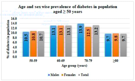 Age–wise and sex–wise prevalence of diabetes in the population aged ≥50 years.