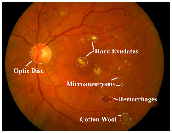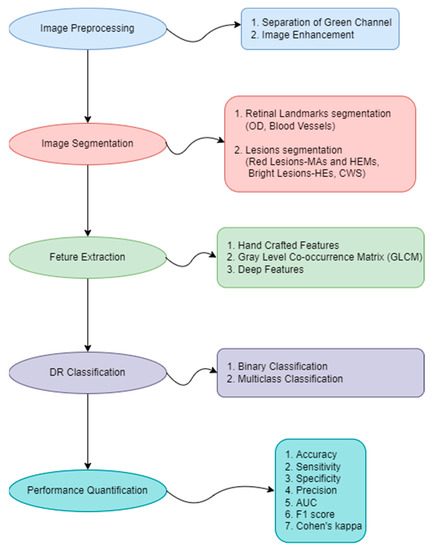 Generally, the steps involved in diabetic retinopathy detection and classification are shown in Figure 19. In image segmentation, retinal landmarks, such as the optic disc [28,29] and blood vessels [30,31] are removed to make lesion segmentation feasible.