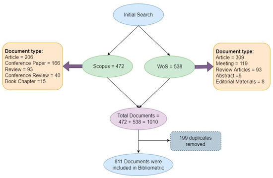 The search strategy [8] is shown in Figure 6, where a total of 472 documents from Scopus and 538 from WoS met the selection criteria for all different document types from 2000 to 2021. The documents were articles, conference papers, review articles, conference reviews, book chapters, letters, abstracts, meetings, early access, editorial materials, and data papers.