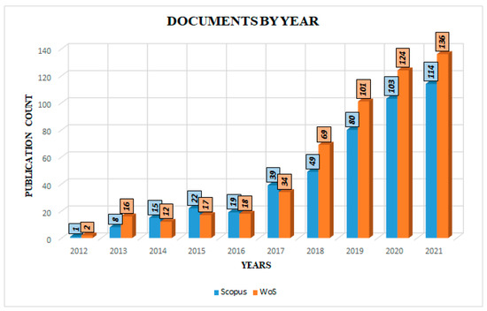 Figure 8 shows a bar graph of the number of documents published yearly in Scopus and WoS from 2012 onward. Researchers started working on diabetic retinopathy detection using machine learning in 2000. Initially, very few papers were published, and after 2013, we found a substantial increase in publications, with 114 (Scopus) and 136 (WoS) in 2021.