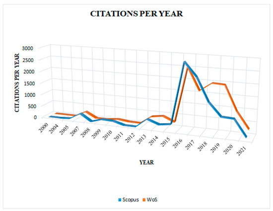 The detailed analysis is shown graphically in Figure 9. It was observed that several citations received were at the peak for the papers published in the year 2016. One of the documents received 2571 out of 2827 citations (Scopus) and 2386 out of 2531 citations (WoS) in 2016. The document titled “Development and validation of a deep learning algorithm for the detection of diabetic retinopathy in retinal fundus photographs” was published in JAMA—Journal of the American Medical Association by Gulshan V et al. [9] and was included in both the databases and referred to by many researchers.