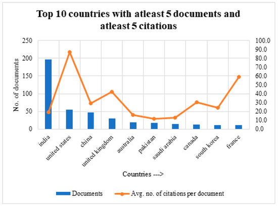 The analysis shows that 24 out of 57 countries published at least five documents with at least five citations. The following graph (Figure 10) shows the top 10 countries with at least five papers and at least five citations. From the analysis (Table 2), it is clear that the United States published fewer documents than India, but the average number of citations received was higher.