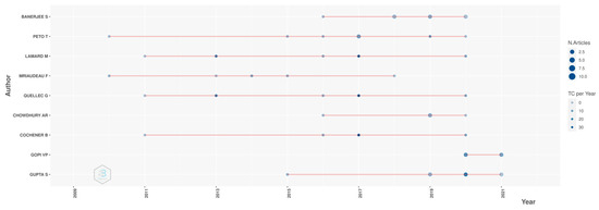 The papers produced by the top 10 authors were analyzed over time (Figure 13). S. Banerjee [10] started working in this area in 2016 with one paper with total citations per year of 2.29. T. Peto [11] and M. Lamard [12] started their research around 2010, working till 2021 with five and seven articles, respectively. The top authors’ production over time in terms of the no. of papers and total citations per year was plotted (Figure 13) and listed in tabular form (Table 3).